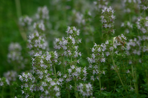香草として肉料理や煮込み料理の香付けなどに用いられるタイム(学名Thymus)は、シソ科の植物。一般にタイムと呼ばれる香草には200種以上があり、植物はガーデニング用や食用として、また一部の種類のタイムから採れる精油などは民間療法で薬草、ホメオパシー、医薬品などに用いられている。プランターや鉢植えなどでも手軽に育つのが特徴。タイムの葉には、精油(カルバクロール、ゲラニオール、リナロールなど)やフラボノイド(アピゲニンなど)、防腐効果のある物質(ロスマリン酸など)、フェノールカルボン酸(コーヒー酸、クマル酸など)、多糖類などが含まれる。芳香があり少し辛味があることから、唾液や胃液胆汁の分泌を促進し食欲と消化の増進に効果があるほか、精油は慢性気管支炎や上部呼吸器官のカタル症状(粘膜の腫れ、粘液分泌による鼻水・痰など)への抗痙攣剤として用いられる。また黄色ブドウ球菌や大腸菌などに対する抗菌効果、抗酸化効果、抗寄生虫効果なども、実験室レベルでは明らかにされている。